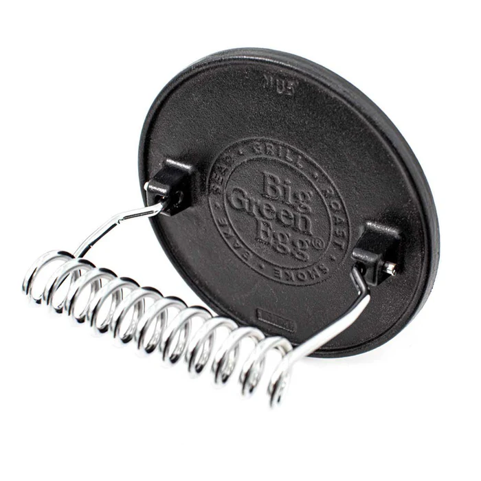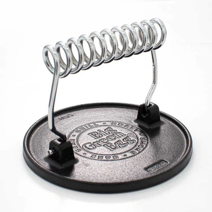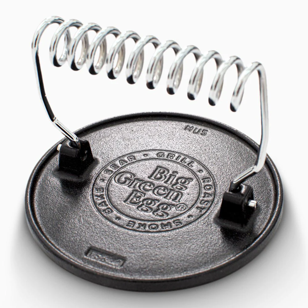The Big Green Egg Cast Iron Grill Press creates perfect “smash” burgers with crispy edges and a juicy centre, and prevents curling when cooking bacon or ham.
