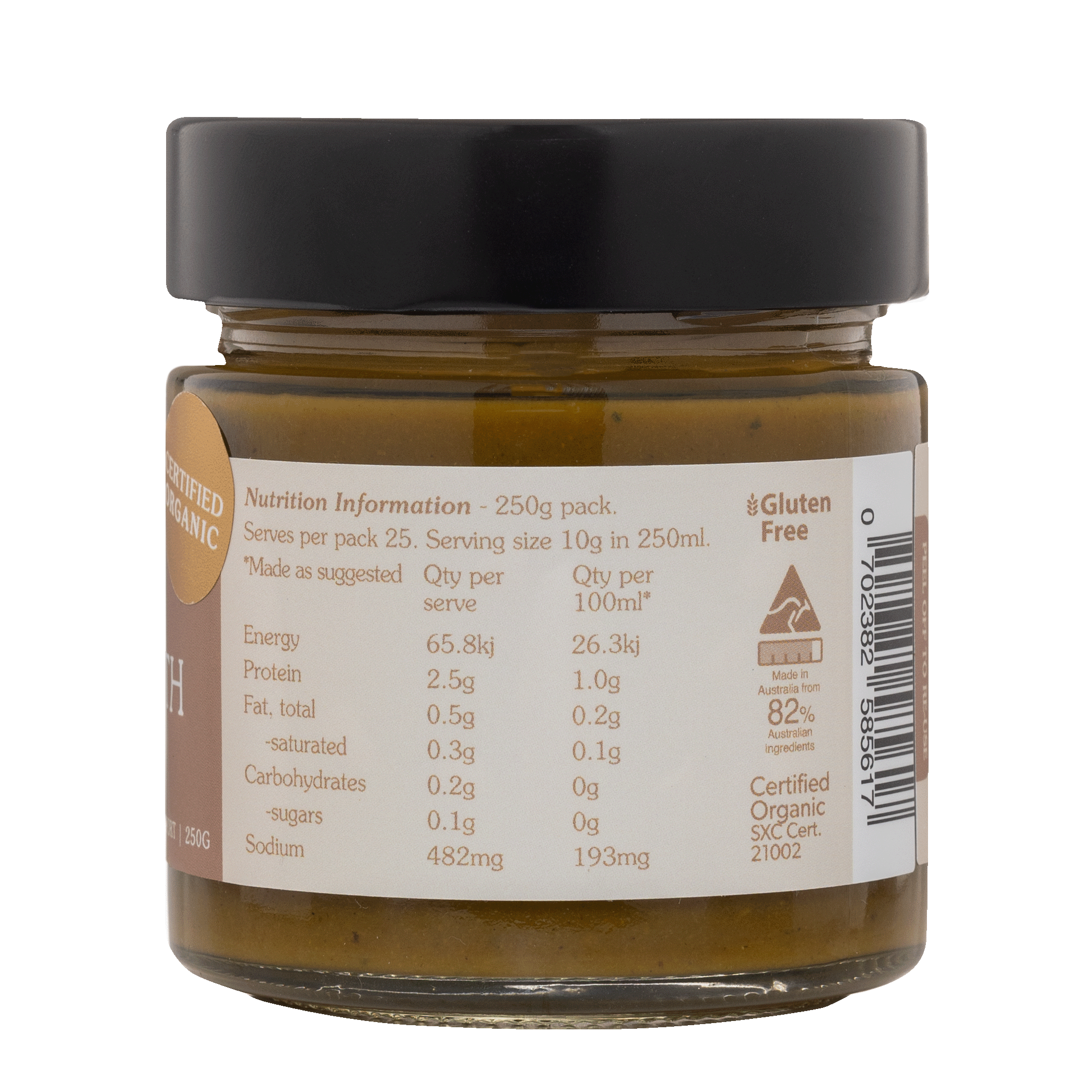 The world’s first certified organic beef bone broth concentrate. Luscious and rich in flavour, this concentrate isn’t just delicious, it’s collagen and amino acid dense helping support gut health, strengthen immunity and improve general wellbeing. Simply add 2 tspn to 250ml of water and enjoy as a broth, use as a base in soup or add to any savoury dish for an impressive depth of flavour and complexity.